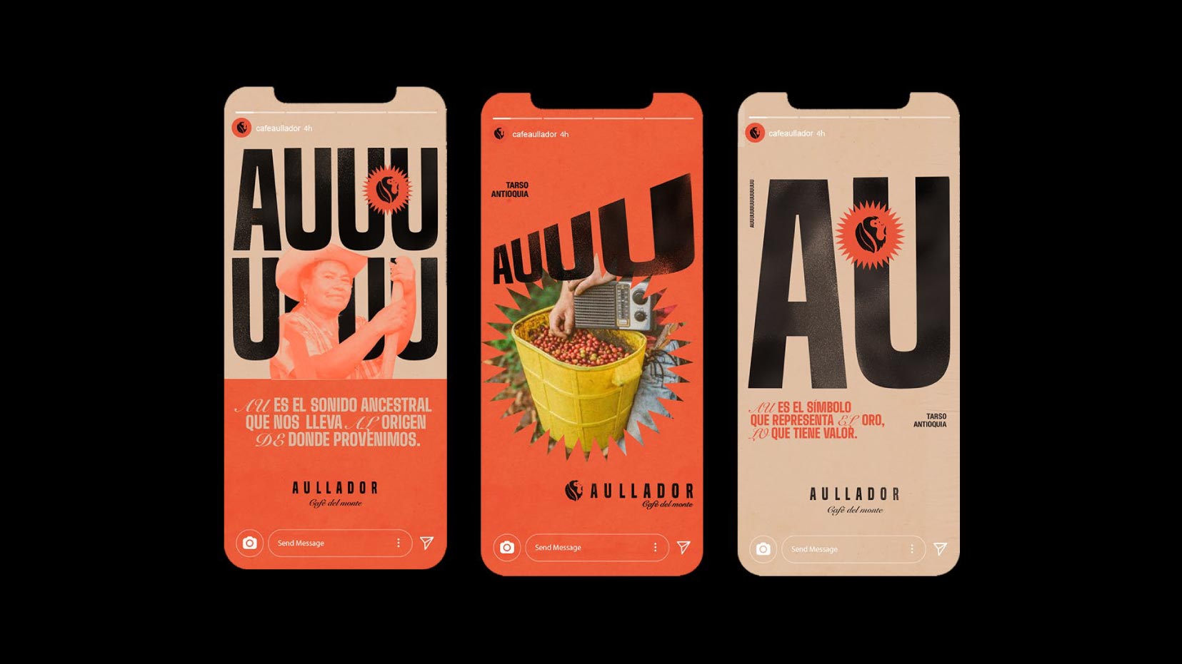 Desarrollamos un mensaje y un diseño alineados con esos valores, manteniendo la esencia del logo pero incorporando tipografías inspiradas en el stencil, un estilo activista y revolucionario. Sintetizamos “AU” como símbolo del oro, representando lo que la marca valora más que el dinero: la naturaleza, la conservación y las relaciones humanas, además de su conexión con el sonido del mono aullador.