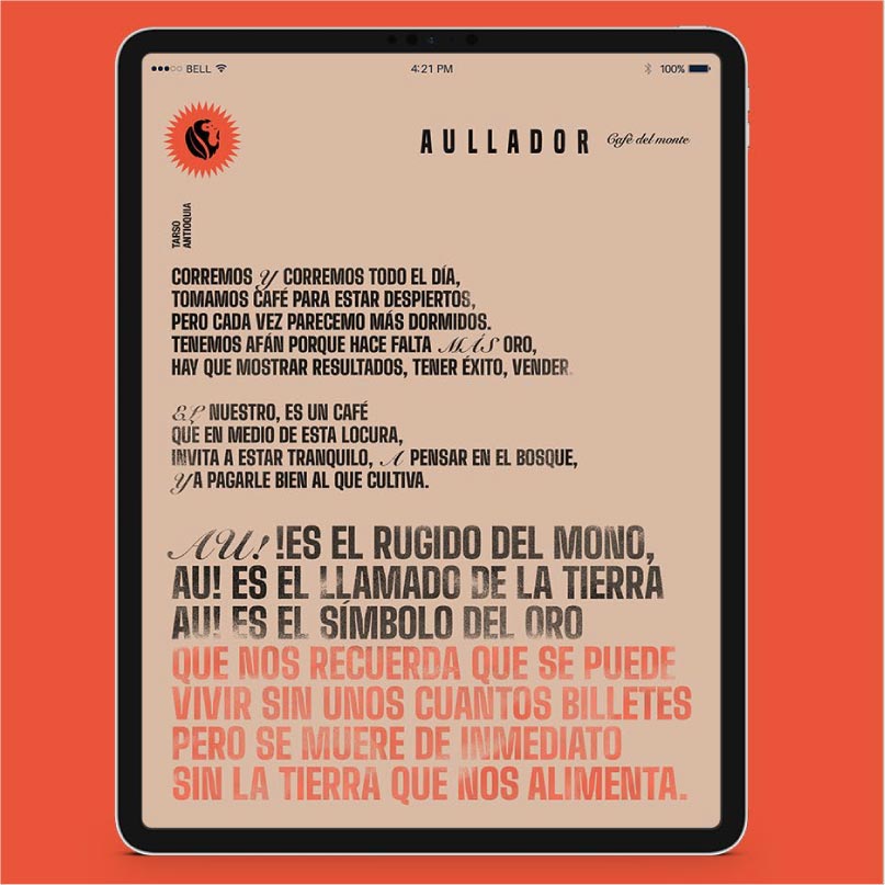 En el suroeste antioqueño, Café Aullador cultiva café de alta calidad para financiar la conservación de la montaña y la protección de los monos aulladores. Es una marca responsable con los campesinos que trabajan en ella y tiene un propósito claro: cuando cumpla su misión de preservar la reserva, sabrá que su tiempo habrá llegado. Es una marca dedicada a un legado ecológico y social.